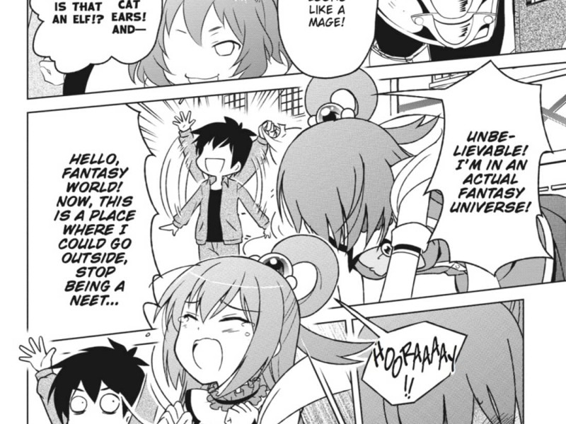 Kazama Sato est mort, ou plutôt, était mort. Sous la contrainte de l'au-delà, il se retrouve dans un monde imaginaire de type rpg avec la déesse Aqua, une bêcheuse à l'air vif, qui lui a proposé de l'y envoyer. Ensemble, ils partent à la recherche du Roi des Démons et le combattent ... ou ils le feront si eux et leur groupe peuvent un jour être plus qu'une bande de fous inadaptés. Sur Terre, Kazuma était un NEET et un hikikomori, ne sortant de sa maison que pour la sortie du prochain jeu vidéo en édition limitée. Cependant, lorsqu'un de ces voyages se termine par un choc auto-induit, il accepte l'offre de la déesse Aqua d'aller dans un monde fantastique, l'emmenant avec lui comme compagnie. Une fois arrivés, ils découvrent que la vie d'aventurier n'est pas du tout ce qu'ils imaginaient. Il s'avère que l'aventure, c'est un peu plus la pauvreté et la bave de grenouille géante que le plaisir et les jeux. Ils décident donc de chercher d'autres membres du groupe pour les aider dans leurs quêtes et sont rejoints par l'Archimage Megumin, un maître de la magie de l'explosion qui ne peut lancer qu'un seul sort par jour, et Darkness, un croisé masochiste qui prend simplement son pied à l'idée d'être molesté par des monstres. Avec quatre aventuriers aussi habiles dans la fête, que pourrait-il bien se passer ? Une petite mise en garde avant de commencer cette revue : si vous êtes venu à la série Konosuba par l'adaptation de l'anime 2016 par Studio Deen, la version manga de Konosuba, tout en couvrant la même histoire de base, est étonnamment différente, tant dans les petits détails de l'intrigue que dans le ton émotionnel de l'œuvre. Dans cette optique, comment se porte Konsobua sous forme de bande dessinée ?