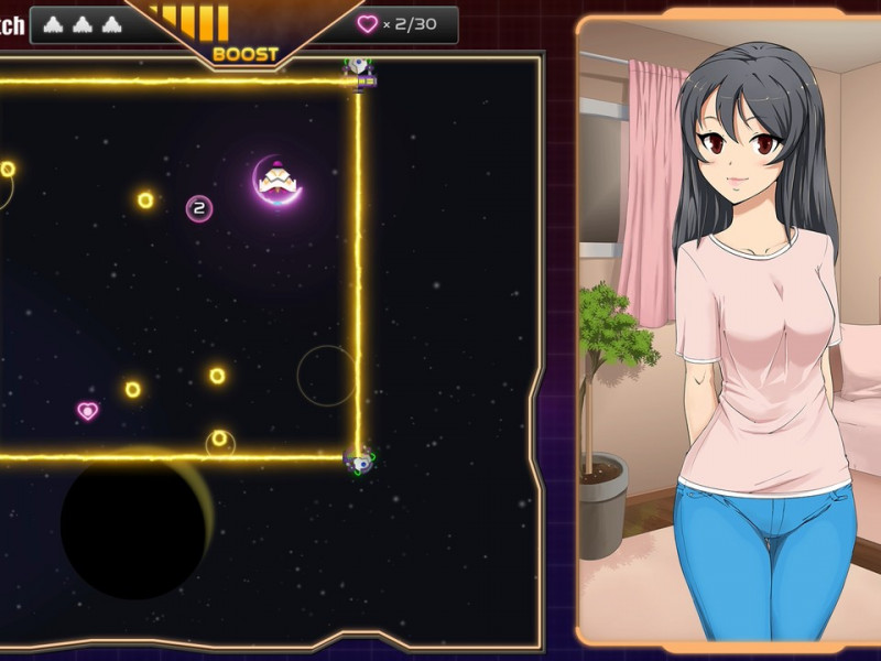 Les ennemis sont esthétiquement pauvres mais fonctionnels. Chaque fille a son propre ensemble d'ennemis qui apparaîtront aléatoirement à l'écran en effectuant leur propre barrage d'attaques. En gros, chaque niveau est divisé en trois étapes, chaque étape ayant ses propres ennemis et dix cœurs à collecter. Les ennemis sont un peu de tout : des tourelles à une seule balle aux murs entiers de lumière qui traversent l'espace, en passant par des objets de formes et de tailles diverses qui se déplacent à leur manière. Apprendre comment ils se déplacent, comment ils tirent, et donc comment les éviter, est essentiel pour arriver au bout. Mais si l'action se déroule dans l'arène à gauche, à droite nous avons la jeune fille de service plus ou moins habillée selon le niveau. En fait, la jeune fille ne se déshabillera pas au cours du niveau, changeant simplement d'expression en cas de succès ou d'échec. Les jeunes filles perdront leurs vêtements et changeront de position au fur et à mesure de leur progression dans les niveaux. À chaque niveau, un vêtement de moins, jusqu'au sprite animé piquant final. Comme prévu, Shuttlecock-H ne compte que trois filles pour une galerie de contenu assez pauvre qui, combinée à une longévité qui tend à être faible, fait de ce jeu un débutant malicieux. Et en parlant de galerie, celle-ci contient toutes les images débloquées (sprites animés inclus). Vous pouvez " habiller " les filles à votre guise (bien que limité à leurs vêtements dans les campagnes) et même changer leur expression.